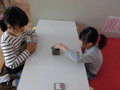 3組では,古典に親しむために「小倉百人一首」について学習しました。まず,一枚一枚絵札を見ていき,「殿札」,「坊主札」,「姫札」の3種類があることを確認しました。4年生は,以前に「坊主めくり」もしたことがあるので,2年生の友達にルールを教えながら,坊主めくりを楽しみました。