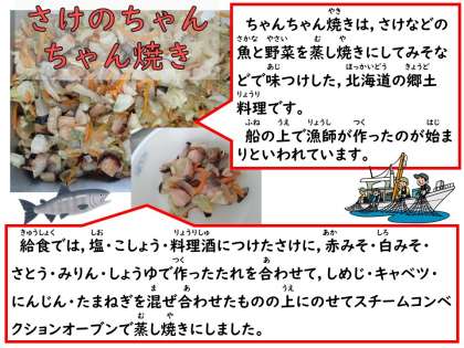 さけのちゃんちゃん焼きは,北海道の郷土料理のひとつです。北海道でたくさんとれるさけなどの魚と野菜を蒸し焼きにしてみそ味のたれで味つけします。さけと一緒にたくさんの野菜も食べられます。給食では,塩・こしょう・料理酒で生臭みを取ったさけに,みそだれをからめて,混ぜ合わせて広げた野菜の上にのせてスチームコンベクションオーブンで蒸し焼きにしました。さけのうまみやみそだれが野菜にもしみて,ごはんによく合います。スチームコンベクションオーブンで仕上げる献立は,ちゃんちゃん焼きのほかにも焼き魚やグラタンなどがありますが,どれも子どもたちに大人気です。