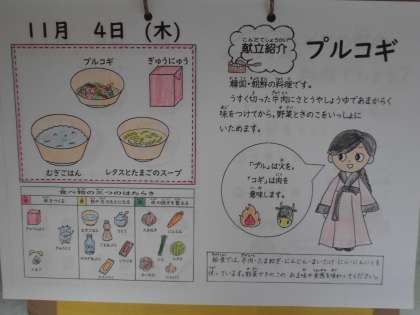 11月4日(木)の献立は,「麦ごはん,牛乳,プルコギ,レタスと卵のスープ」でした。プルコギは,韓国・朝鮮の料理です。薄く切った牛肉にさとうやしょうゆで甘辛く味をつけてから,野菜ときのこを一緒に炒めます。「プル」は火という意味で,「コギ」は肉を意味します。給食では,牛肉・玉ねぎ,にんじん・まいたけ・にら・にんにくを使っています。野菜やきのこの甘味や食感を味わいながらいただきました。