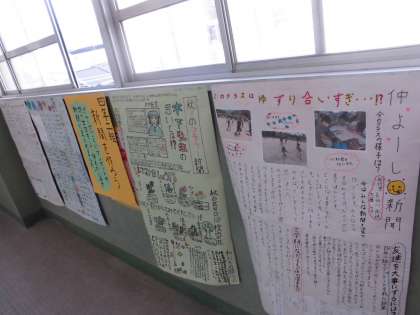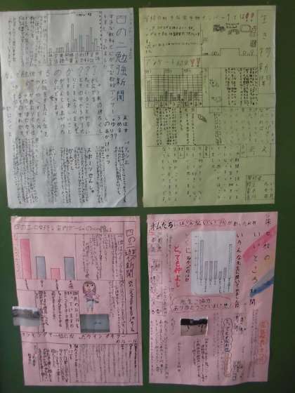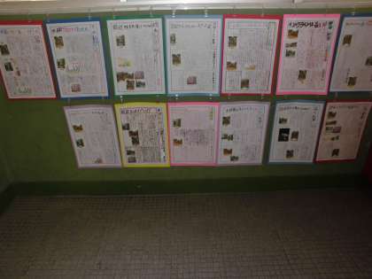 4年生の廊下にはアンケートしたことや調べ学習をしたことを新聞にまとめて掲示してあります。