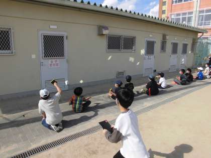 日光がよく当たる場所とあまり当たらない場所の様子を比べました。温度は午前中では,15度以上違う場所があり,手で地面をさわってもあたたかさの違いがはっきりわかりました。