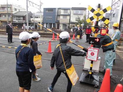 嵐電教室では,西院車庫で踏切の安全なわたり方の学習,洗車体験,車両の連結の見学などをしました。後に,貸切り電車で車庫から大宮駅,大宮駅から帷子ノ辻駅まで乗せていただきました。車窓から朱七小が見えた時はみんな大興奮していました。