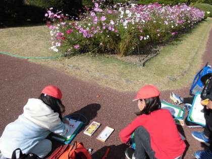 ウォークラリーの後は、バラ園でグループ活動を行いました。グループで1つお気に入りのバラを選び、記念撮影を行いました。その後は、好きなお花のスケッチです。色んな色のバラやお花が咲いているので、子ども達のスケッチもとっても鮮やかでした。