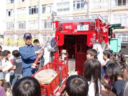 また、実際の消火活動の様子を実演してもらい、その手際のよさや見事な役割分担から、消防士さんの仕事の大変さ、日ごろの訓練の大切さを学びました。