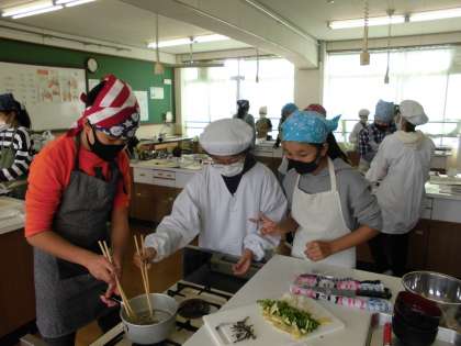 みそ汁の具材を細かく切ったりして,グループごとに声をかけ合って楽しく進めていました。日本の伝統食であるみそ汁の高い栄養やおいしさを味わっている様子でした。