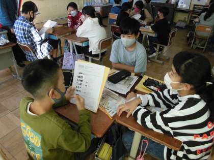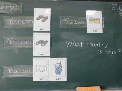 現在,外国語の学習では,今年,新たに学習した「Can:〜できる」という表現や,「I + 動詞 〜」といった表現を使い,自分の行ってみたい国を紹介しようということをめあてに,学習に取り組んでいます。まずは,自分が行ってみたい国について,どんな場所に訪れたり(visit),どんなものを見たり(see),食べたり(eat),飲んだり(drink)してみたいか調べ,クイズ形式にして友だちと交流しました!
