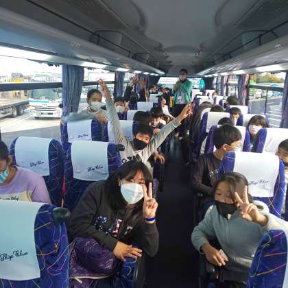 バスの中では,おしゃべりを控えています。みんな到着を楽しみにしています。