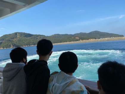 うずしおクルーズ船に乗り,出航しました。天気もよく潮風観潮がとても心地よいです。渦潮のポイントに向かってクルーズ船は勇ましく進んでいます。