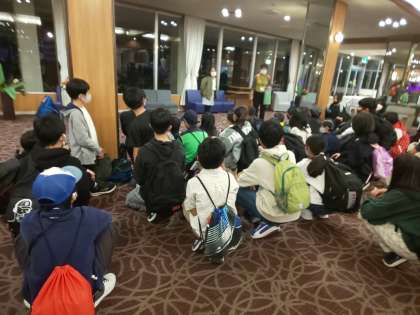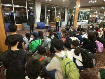 6年生一行は,本日の宿泊先,国民宿舎慶野松原荘に無事到着しました。検温・消毒を経て,入館式を終え,ほっと一息。これから一日,お世話になります。