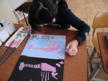 3組の4年生の図工「ほって すって 見つけて」では,初めて彫刻刀に挑戦しました。以前に「はさみのアート」で作った水の生き物を一版多色版画で表現することにしました。はじめは彫刻刀の使い方もよくわかりませんでしたが,だんだん上手になってきています。色を付ける作業に入っています。どんな作品になるか楽しみです。