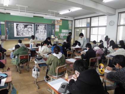 図工の学習で版画に取組んでいます。運動会の団体演技「フラッグ」を題材に作成しています。下絵を板に写して彫刻刀で彫り進めています。