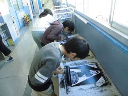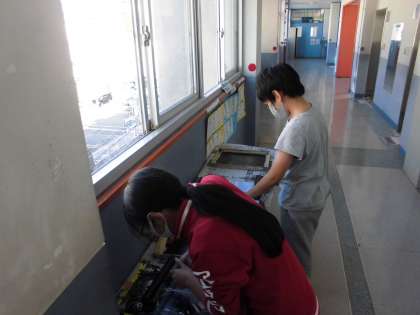 図工の版画はとうとう大詰め,和紙に刷る工程まで来ました!!スケッチの段階から細かい部分まで丁寧に時間をかけ,それをもとに,部分によって彫刻刀を変えながら彫り進めてきました。ここまで頑張って作り上げてきたこともあり,それぞれ,黒と白のコントラストが美しく仕上がりました!