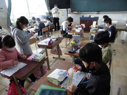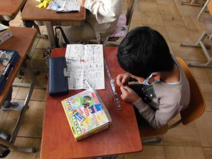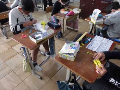 乾電池と豆電球などのつなぎ方と乾電池につないだ物の様子について学習する実験キッドを興味津々に説明書を読み熱心に設置していました。