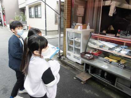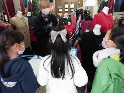 3・4人のグループごとに,婦人服・食料品・酒屋・お肉屋など10店舗以上のお店へ,インタビューに行きました。