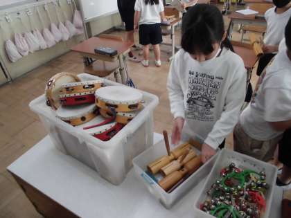 好きな楽器を選んで気に入ったリズムをお友達とお話をするように,楽器をならして発表していました。音楽づくりにとても楽しそうに取り組んでいました。