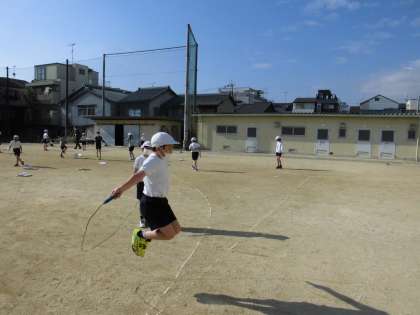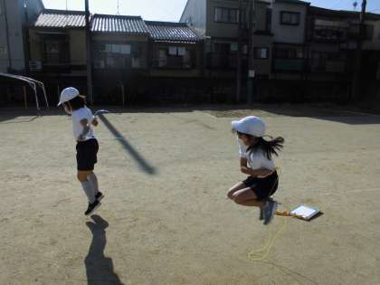 3年生は体育の授業で,暖かい日射しの運動場でなわとびに取り組んでいました。
