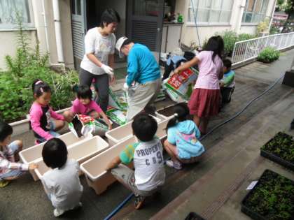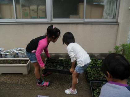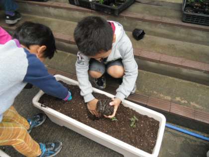 1つ目の活動は,春の花の苗の植え替えです。ポピー,なでしこ,きんせんか,スターチスなど8種類,9月にまいた種がしっかり育っています。子どもたちは,その小さな指で苗をはさみ,ポットを逆さにして土ごとそっと取り出し,プランターに植え替えていきます。校長先生がおられなくても,教えていただいたとおり,みんなちゃんとできました。