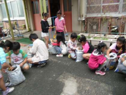 今日の2つ目の活動は,大根の種まきです。トウモロコシを育てたあとの袋の土に,肥料や腐葉土を入れてよく混ぜます。先に水遣りをしてから青首大根の種を4粒,上から土をぱらぱらとかけたら完了です。プランターには丸大根の種をまきました。冬にはおいしい大根が収穫できるといいね。