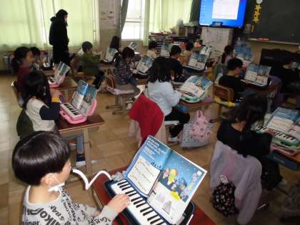 教室を入ると,子どもの素敵なオルガン伴奏で「キラキラ星」を練習していました。鍵盤ハーモニカも体をゆらし,きらきら輝く星を思い浮かべながら弾いているようでした。,