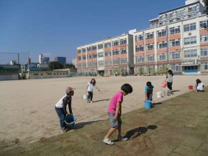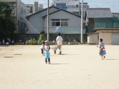 そして,後半戦スタート。子どもは,運動場南西端の砂をバケツで運んで,張った芝に撒く作業,大人は,余った芝を運動場北側に張る作業に取りかかりました。