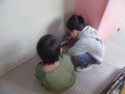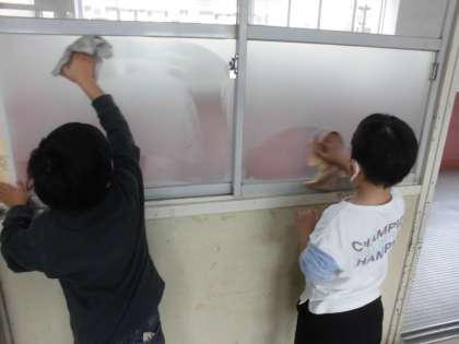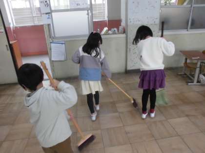 今年1年のよごれを掃除しました。いすやつくえの底のほこりを取ったり,窓のさんのすみをぞうきんでふいたり,傘立てをどけて小ほうきではいたりしました。とてもきれいになりました。気持ちのよい3学期が迎えられると思います。