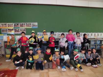 自分を何に変身させたら楽しいか想像しながら,画用紙や身近な材料を使い,製作していました。友達同士で見合ったり協力したりしていて,とても楽しそうです。