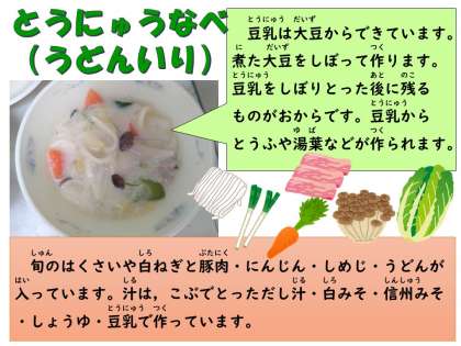 豆乳鍋は,こぶでとっただし汁に豚肉・旬のはくさいや白ねぎ・にんじん・しめじと白みそを入れて煮て,うどんと豆乳を入れてもろもろにならないように弱火でじっくり煮ます。さらにしょうゆと信州みそを入れて味つけしました。具だくさんでうどんも入ってボリュームたっぷりの豆乳鍋です。とろみがあるので冷めにくく寒い日に体も温まります。1年生は豆乳を食べ慣れない子もいたようですが,子どもたちは「おいしかった。」「うどんたくさんでうれしかった。」「おなかいっぱいになった。」と感想を聞かせてくれました。