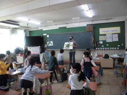 1年生の英語活動では,絵本「はらぺこあおむし」英語版のよみきかせがありました。子どもたちは,大喜びです!興味津々に英語を聞き入っていました。そして,友達とも楽しい雰囲気でリズムに乗って体を動かしながら英語と親しんでいました。