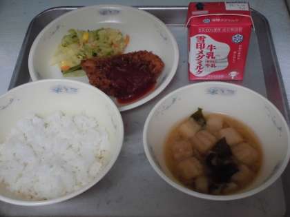 3月11日(金)の献立は,「ごはん,牛乳,トンカツ,野菜ソテー,みそ汁」でした。今日は,6年生の卒業をお祝いする行事献立でした。調理員さんが一つずつ心をこめて衣をつけて作ってくださいました。