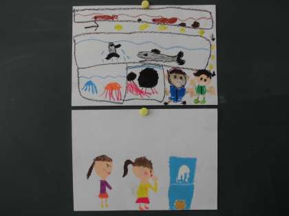 「遠足で水族館へ行ったよ。オオサンショウウオやクラゲがいたよ。イルカショーを見たよ。イルカが高くまでとんだのがすごかったよ。」