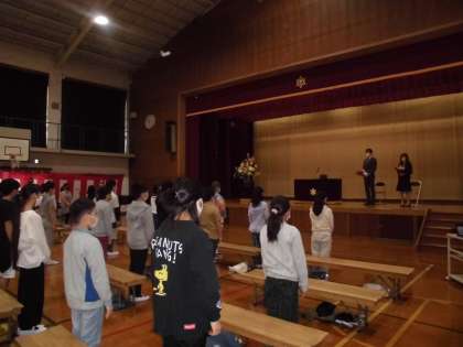 これまでの思い出や感謝の気持ちで教職員のお別れをしました。離任させる先生方のお話を体育館や教室で真剣に聞いていました。