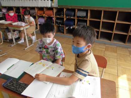 国語の学習 「詩を楽しもう」では,谷川俊太郎さんの詩「どきん」を音読しました。どんなふうに工夫すると楽しく音読できるかを考えて,まずは1人で,次に2人組で読合いました。学習の終わりには「はじめは棒読みで楽しくないなと思ったけど,色々な工夫をして,想像して読んだら楽しく読めました。」と振り返っていました。