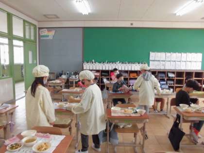 昨日から給食が始まりました。コロナ禍のおり,黙食を徹底しての給食時間ですが,新しい教室で,みんなで食べる給食はおいしく楽しい時間です。今日のメニューは「なごみ献立」で,たけのこのかきあげ,小松菜のにびたし,お味噌汁と,和食をおいしく味わうことができました。