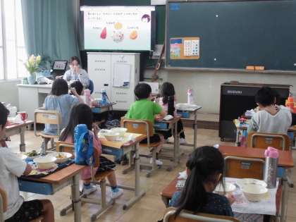 4月15日(金)は,和食推進の日,4月の和(なごみ)献立でした。メニューは,「ごはん,たけのこのかきあげ,小松菜の煮びたし,みそ汁」でした。和(なごみ)献立の日は,和食や献立についての動画を見て給食をいただきます。動画には,和(なごみ)献立を紹介するキャラクターである「かずくん」と「なごみちゃん」が登場します。