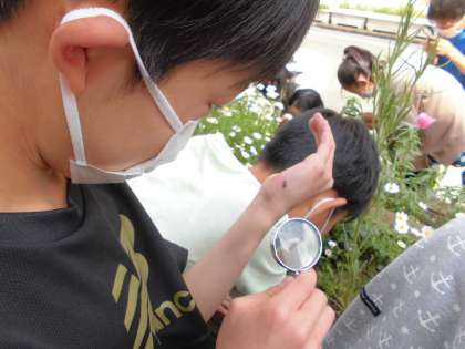理科の学習で生物の観察をしています。今日は虫眼鏡の使い方を学習して実際に虫眼鏡を使って観察をしました。「動かせるもの」を見る場合と「動かせないもの」を見る場合では虫眼鏡の使い方が少し違います。その違いを意識して,対象物を観察しました。