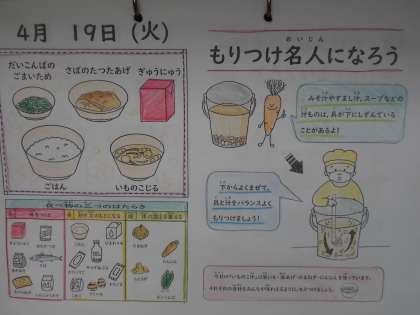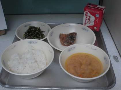 4月19日(火)の献立は,「ごはん,牛乳,さばの竜田揚げ,だいこん葉のごまいため,いものこ汁」でした。さばの竜田揚げは衣がパリパリで食感を楽しんでいただくことができました。いものこ汁には,里いも・油あげ・たまねぎ・にんじんが使われていて具だくさんでした。今日もおいしくいただきました。