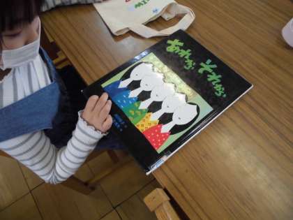 絵本の読み聞かせをききながら,本の正しい使い方を知りました。