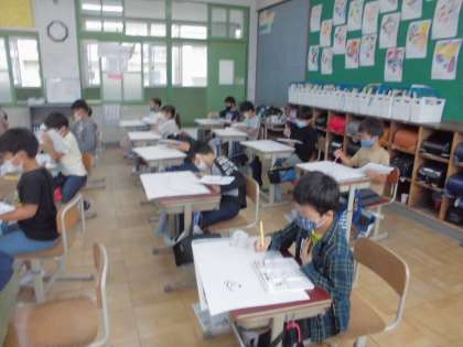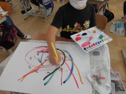 絵の具や水,筆の使い方をためしながら,心に浮かんだことを画用紙に表現しました。 お魚のうろこに色を付ける,絵お具セットの使い方で学習したことを活かして,思い思いに表現しました。水の量を調整することで,滑らかな線になったり,かすれた線が出来たり,筆の運び方で線に動きが生まれたり,色まぜをしてきれいな色を作っていたりと,とても楽しい作品が出来上がりました。
