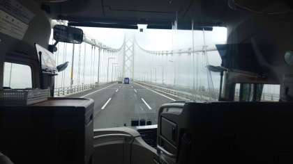 バスは順調に進み、淡路島に到着しました。雨は止んでいますが、霧がかかっていて、周りが見えにくくなっています。