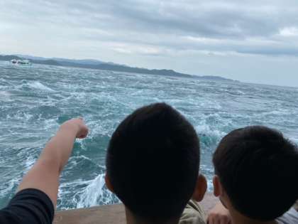 鳴門の渦潮名物,うずしお観潮船WONDER NARUTOに乗船しました。潮風がとても心地良いです。子どもたちは,自然の雄大さに感動していました。