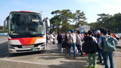 今日の活動の開始です。バスに乗って出発しました。