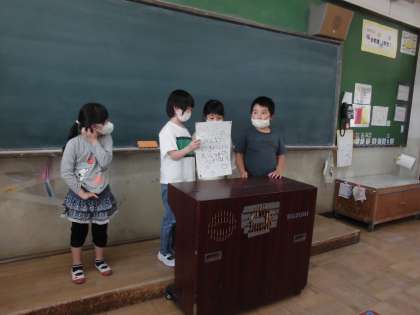 4月28日(金)6時間目は3年2組で交流学習でした。学活の授業で係活動をしました。交流学級では,「みんな きょうりょく せいとんがかり」のメンバーになっています。今日は,係のポスターを作りました。前に出て発表するメンバーの友達と一緒前に立って紹介しました。