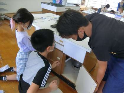 家庭科の学習で,家庭科室の探検をしました。調理に使う道具をたくさん見つけていました。早く調理実習がしたいとワクワクしています。