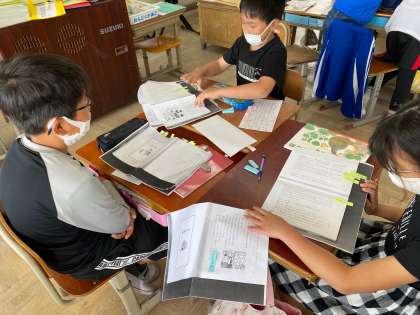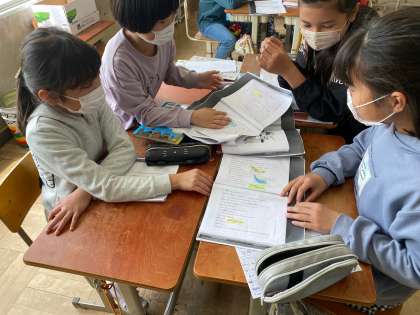 本の紹介リーフレットを作るために,同じ物語を選んだ友達と交流をしています。