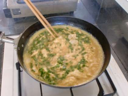 Aさんの提案により,「なっとういため」と「いりたまご」をつくることになりました。作り方はAさんが説明してくれました。「たまごを割る」「なっとうやたまごをまぜる」「フライパンで炒める」などの調理を交代で行いました。刻みねぎの入った「なっとういため」と「いりたまご」は彩りもよく,とてもおいしくいただきました。