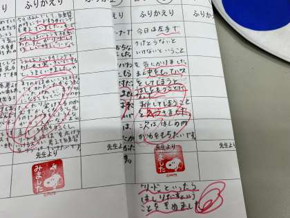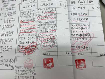 「バトンの持つ位置を真ん中ではなく,端にする。」「相手にバトンを渡すときには,声をかける。」「バトンを渡す前リードと声をかけて,相手が走り出せるようにする。」など,自分たちのチームの課題から次のめあてへとつなげていました。