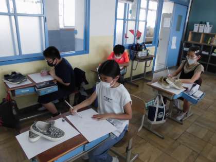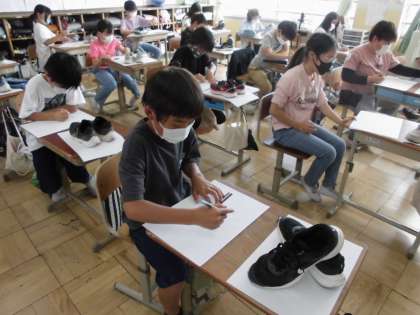 自分の靴がかっこよく見えるポーズを考えて,しっかりと見て描いています!