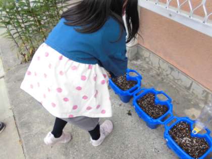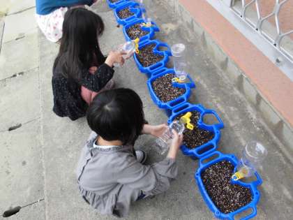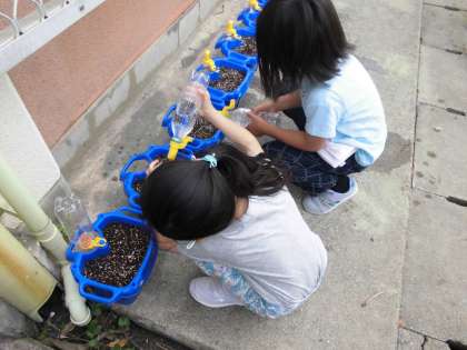 アサガオさんとお話をして,「のどかわいてると思うし水をやる!」「まだ,芽は出てこないみたい」と楽しく伝えてくれました。毎日のお仕事が増えて大変ですが,成長を見るのが楽しみですね!
