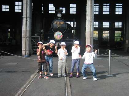 絶好のお天気に恵まれて梅小路公園へ校外学習に出かけました。蒸気機関車館では、館内を見学したり、蒸気機関車の運転席に乗ったりしました。また、SLスチーム号に乗って蒸気機関車の乗り心地を体験しました。出発の汽笛が鳴ると、歓声と拍手が起こりました。横を走るJRの列車を見たり、公園を散歩する人と手を振り合ったりして、とても喜んでいました。