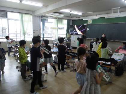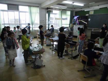 鍵盤ハーモニカの音が聞こえてきました。何年生かな,と思って見てみると,2年生が鍵盤ハーモニカで行進していました。保健室から聞こえてくる「子犬のマーチ」を聞いているとリズムにのって,とても楽しいメロディです。2年生でもこんな合奏ができるんだとうれしくなりました。